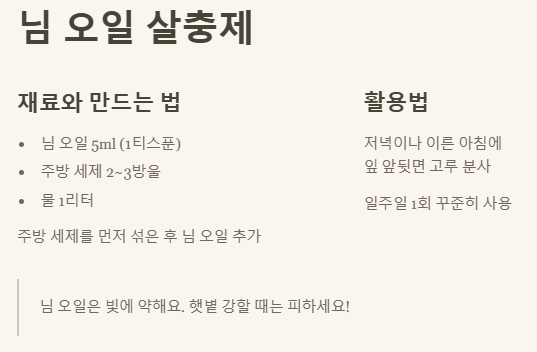 - 재료: 님 오일 5ml (1티스푼), 주방 세제 2~3방울, 물 1리터