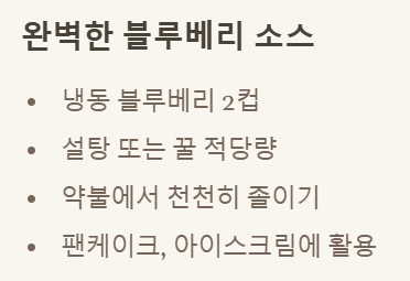 블루베리 소스: 냉동 블루베리를 설탕(또는 꿀)과 함께 약불에 졸이면 근사한 소스가 돼요.