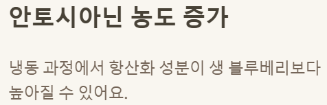 냉동 블루베리는 수확 후 바로 급속 냉동되기 때문에 영양 손실이 적고, 오히려 생 블루베리보다 안토시아닌 농도가 더 높아지는 경우도 있다고 해요.