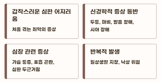 - 신경학적 증상 동반: 앞서 경고 박스에서 말씀드렸던 두통, 팔다리 마비, 발음 장애, 시야 장애, 의식 변화 등이 함께 나타날 때.