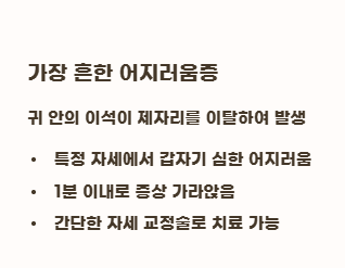 - 주요 증상: 특정 자세, 특히 누웠다가 일어날 때, 고개를 돌릴 때 갑자기 심하게 어지러워요.