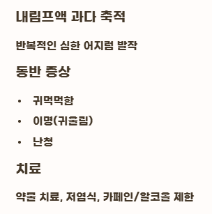 어지러움 발작은 수십 분에서 수 시간 지속될 수 있어 이석증보다 더 고통스러울 수 있어요. - 치료: 약물 치료와 생활 습관 개선(저염식, 카페인/알코올 제한)이 중요하며, 심한 경우 수술적 치료를 고려하기도 합니다.