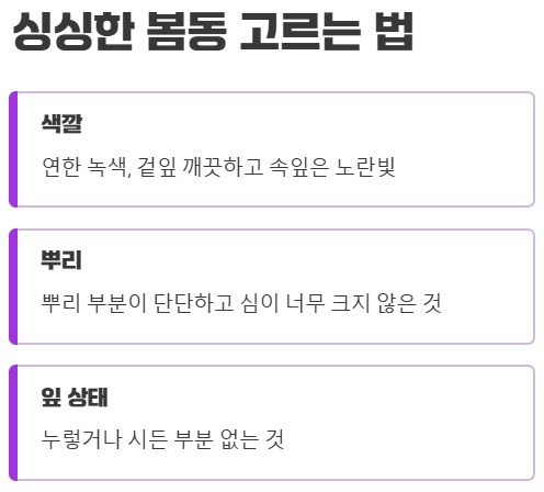 1. 싱싱한 봄동이 맛의 핵심: 잎이 연하고 뿌리가 단단한 것을 고르세요.