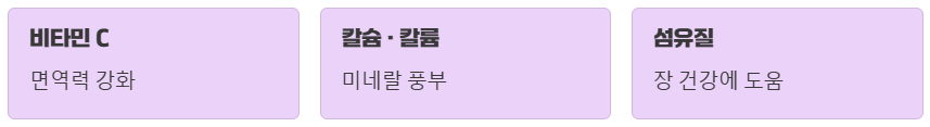 비타민 C와 칼슘, 칼륨 등 각종 미네랄이 풍부해서 면역력 강화에도 좋고, 섬유질이 많아 장 건강에도 도움을 준다고 해요.