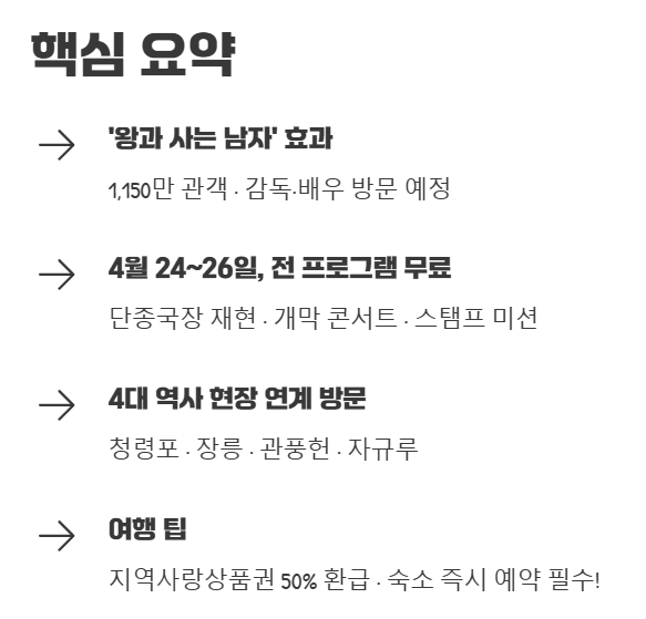 - 3. 주요 볼거리: 단종국장 재현, 개막식 콘서트(이찬원, 양방언), 스탬프 미션 등 다채로운 체험.