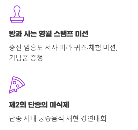 - 궁중음식 경연대회 (제2회 단종의 미식제): 단종 시대의 음식을 재현하는 경연으로, 눈과 입이 모두 즐거운 행사가 될 겁니다.