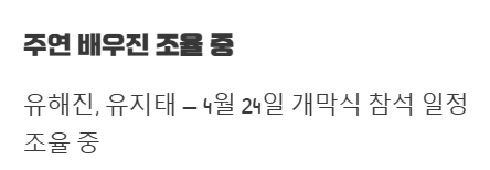 유해진, 유지태 배우님 등 일부 주연 배우들도 4월 24일(금) 개막식 참석을 위해 현재 일정을 조율 중이라고 합니다.
