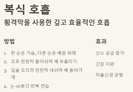 - 복식 호흡: 횡격막을 이용해 깊게 숨쉬어 산소 공급 늘리고 심신 안정.