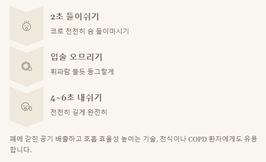 - 입술 오므리기 호흡: 천천히 길게 내쉬어 폐 공기 순환 돕고 호흡 효율성 증대.