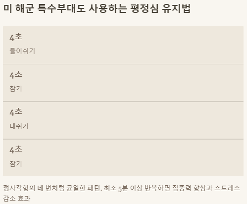 - 박스 호흡: 4초씩 균일하게 숨쉬고 멈춰 집중력 향상 및 평정심 유지.