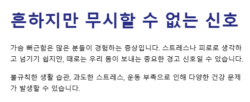 - ✔️ 가슴 뻐근함은 심장, 소화기, 근골격계, 호흡기, 심리적 요인 등 다양한 원인으로 발생할 수 있습니다.