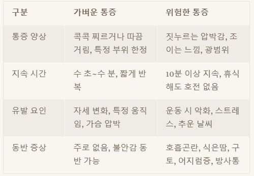 그럼 이제, 흔한 가슴 통증과 위험한 가슴 통증을 어떻게 구별할 수 있는지 표로 한눈에 정리해볼까요? 이걸 잘 알아두면 응급 상황에서 더 현명하게 대처할 수 있을 거예요.