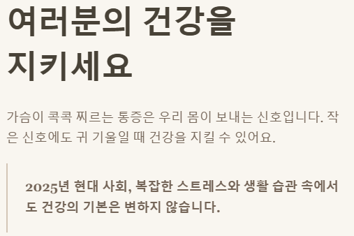 여러분의 건강은 작은 신호에도 귀 기울일 때 비로소 지켜질 수 있습니다. 궁금한 점이 있다면 언제든 전문가와 상담하세요.