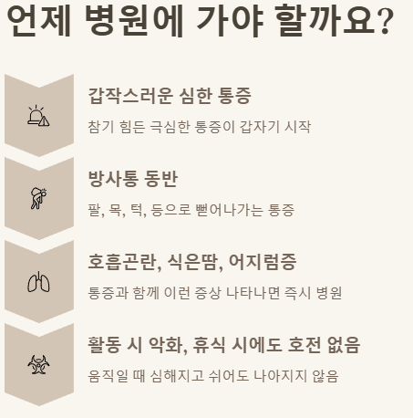 • 호흡곤란, 식은땀, 어지럼증: 통증과 함께 이런 증상들이 나타난다면 즉시 의료진의 도움이 필요해요.