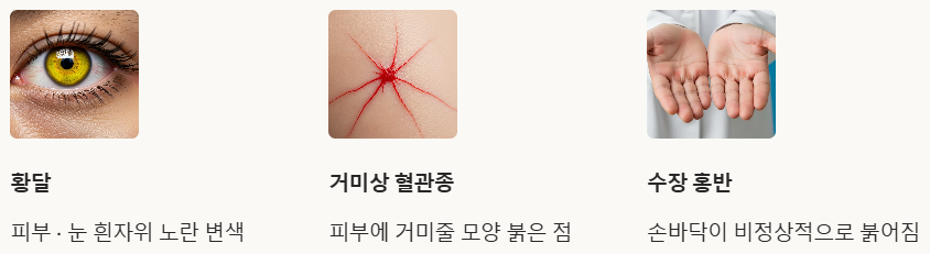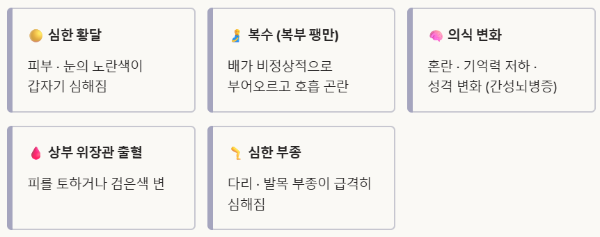 3. 심한 황달, 복수, 의식 변화 등은 간 기능 저하의 응급 신호이므로 즉시 병원에 가야 합니다.