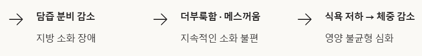 간은 담즙 생성에 중요한 역할을 하는데, 간 기능이 떨어지면 담즙 분비가 줄어들어 지방 소화에 문제가 생길 수 있어요.