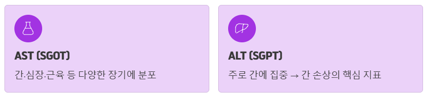 | AST (SGOT) | 0-40 IU/L | 간 외 다른 장기 손상 시에도 상승 가능 |