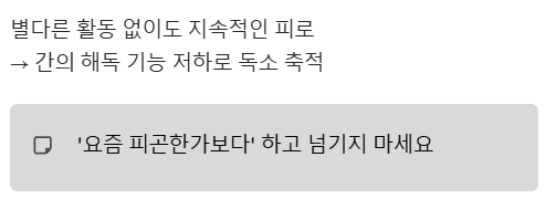 간이 해독 작용을 제대로 하지 못하면 몸에 독소가 쌓여 만성적인 피로를 유발할 수 있어요.