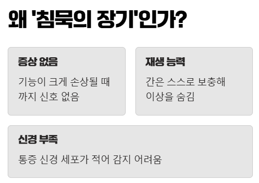 - 간암은 초기 증상이 거의 없는 '침묵의 장기' 질환입니다.