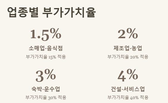 | 기본 세율 | 공급가액의 10% | 0.5%~4%(업종별 부가가치율 적용) |