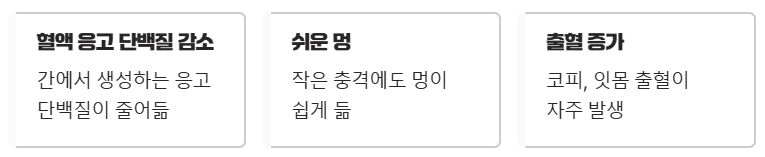 간 기능이 저하되면 이러한 단백질 생성이 줄어들어 작은 충격에도 쉽게 멍이 들거나 코피, 잇몸 출혈 등이 자주 발생할 수 있어요.
