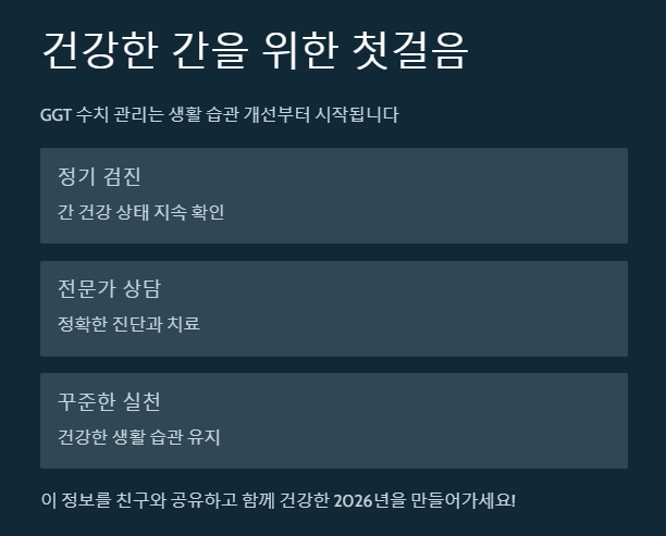 - ✔ GGT 수치 개선을 위해선 금주, 건강한 식단, 규칙적인 운동 등 생활 습관 개선이 가장 중요해요.