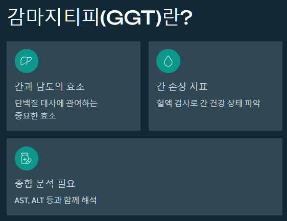 - ✔ GGT는 간과 담도 건강의 핵심 지표이며, 주로 간 손상 및 알코올 섭취와 관련이 깊어요.