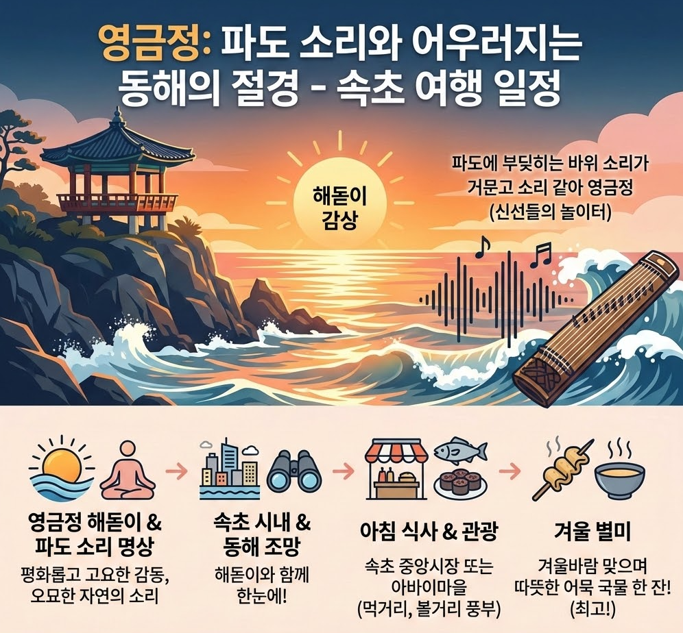해돋이와 함께 속초 시내를 한눈에 조망할 수 있다는 점도 영금정의 큰 매력입니다. 주변에는 속초 중앙시장이나 아바이마을 등 먹거리와 볼거리가 풍부해서 해돋이 후 아침 식사나 관광을 즐기기에도 아주 좋아요. 특히 겨울바람 맞으면서 따뜻한 어묵 국물 한 잔 마시는 건… 음… 정말 최고죠!