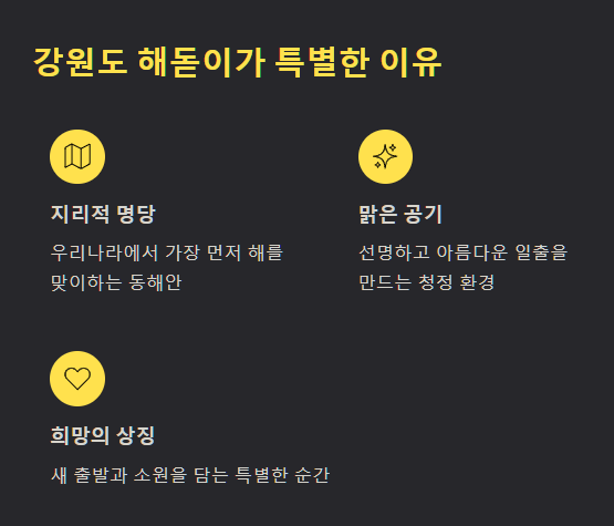이제 제가 추천하는 강원도 최고의 해돋이 명소들을 소개해 드릴 시간인데요. 각 장소의 매력을 제가 느꼈던 그대로 솔직하게 전달해볼게요!