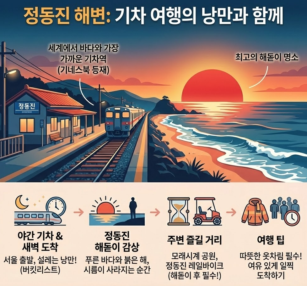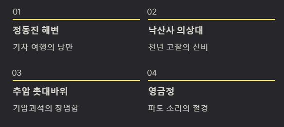 정동진은 뭐니 뭐니 해도 ‘해돋이’ 하면 가장 먼저 떠오르는 곳이 아닐까 싶어요. 세계에서 바다와 가장 가까운 기차역으로 기네스북에도 올랐다고 하니, 그 명성이 괜히 있는 게 아니죠. 특히 서울에서 야간 기차를 타고 새벽에 도착해서 해돋이를 기다리는 그 순간은… 정말이지 잊을 수 없는 낭만을 선사해요. 저는 한 번도 기차를 타고 가보진 못했는데, 개인적으로 언젠가 꼭 시도해보고 싶은 버킷리스트 중 하나입니다!