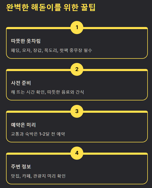 • 따뜻한 옷차림은 필수: 새벽 바닷바람은 생각보다 훨씬 매섭습니다. 패딩, 모자, 장갑, 목도리, 핫팩 등 중무장을 하셔야 해요. 솔직히 이 정도는 다 아시겠지만, 그래도 한 번 더 강조합니다!