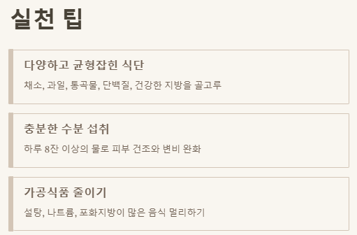 | 항산화 물질 | 세포 노화 방지, 염증 완화 | 베리류(블루베리, 라즈베리), 석류, 녹색 잎채소 |