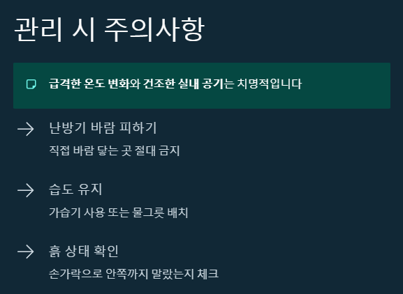 • 물 주기: 겉흙이 마르면 흠뻑 주는 것이 일반적이지만, 겨울철에는 과습에 특히 주의해야 해요. 물을 너무 자주 주면 뿌리가 썩을 수 있으니, 화분 흙의 상태를 꼭 확인하고 주는 게 좋아요. 저 같은 경우는 손가락으로 흙을 살짝 파서 안쪽까지 말랐는지 확인한답니다.