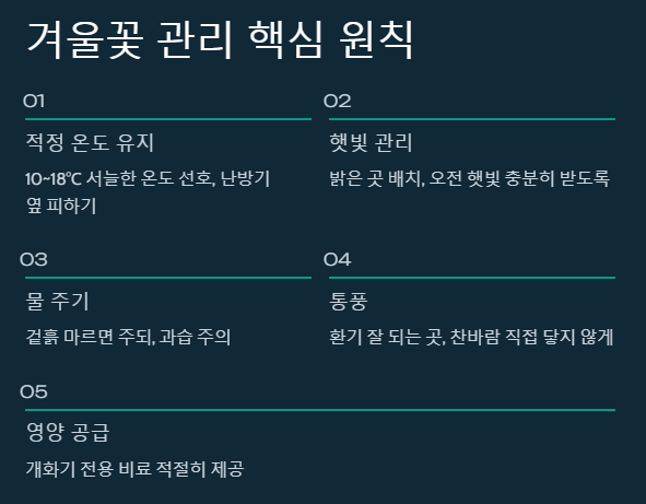 • 적정 온도, 충분한 햇빛, 과습 방지가 겨울꽃 관리의 핵심입니다.