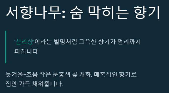 꽃의 아름다움뿐만 아니라 향기로 겨울을 특별하게 만들어주는 서향나무도 빼놓을 수 없죠. '천리향'이라는 별명처럼 그윽한 향기가 멀리까지 퍼진다고 해요. 늦겨울에서 초봄에 걸쳐 작은 분홍색 꽃을 피우는데, 그 향기는 정말이지 한 번 맡으면 잊을 수 없을 정도로 매혹적이랍니다.