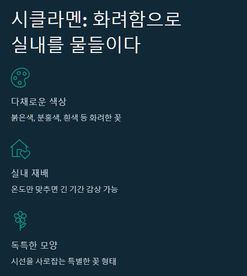 실내에서 겨울의 화려함을 만끽하고 싶다면 시클라멘이 제격이에요. 붉은색, 분홍색, 흰색 등 다채로운 색상과 독특한 꽃 모양이 시선을 사로잡죠. 특히 실내 온도만 잘 맞춰주면 긴 기간 동안 꽃을 감상할 수 있어서 2025년 겨울에도 많은 분들이 찾으실 것 같아요.