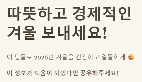 이 팁들을 활용해서 올겨울을 더욱 따뜻하고 경제적으로 보내시길 바랍니다! 😊