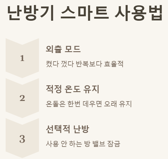 - 난방기 효율적 사용: 난방기를 켰다 껐다 반복하는 것보다, 외출 시에는 '외출 모드'를 활용하거나 적정 온도를 살짝 낮춰 계속 유지하는 것이 에너지 효율 면에서 더 좋다는 사실! 온돌 난방의 경우, 한 번 데워진 바닥은 금방 식지 않으니 참고하세요. 그리고 사용하지 않는 방은 난방 밸브를 잠가두는 것도 좋은 팁입니다.