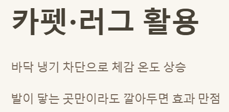 - 카펫/러그 활용: 바닥의 냉기를 막아주고 실내 열 손실을 줄이는 데 카펫이나 러그가 큰 역할을 합니다. 발이 닿는 곳만이라도 깔아두면 체감 온도를 훨씬 높일 수 있어요.
