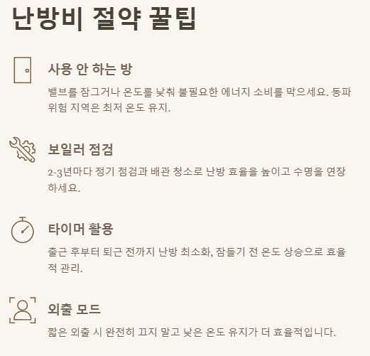 - 4. 보일러 타이머, 외출 모드, 정기 점검으로 난방비를 똑똑하게 절약하세요. 스마트한 습관이 따뜻하고 경제적인 겨울을 만듭니다.