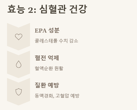 - ✅ 혈관 청소부: EPA 성분이 혈중 콜레스테롤을 낮춰 심혈관 질환을 막아줘요.