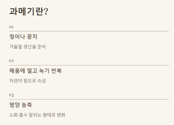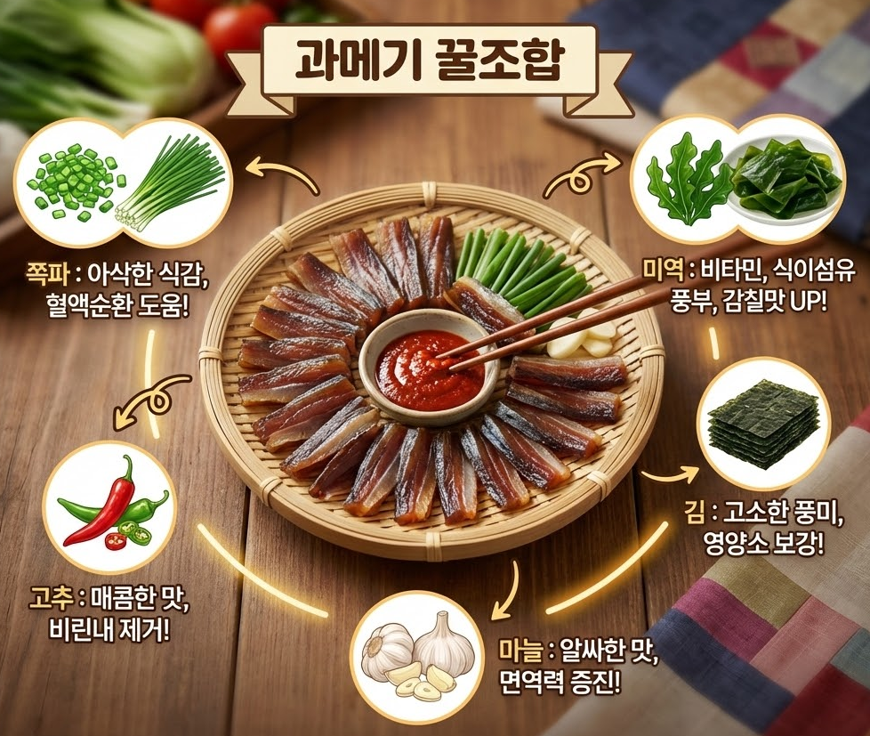 💡 꿀팁: 과메기는 숙성 과정에서 단백질, 지방, 비타민 등이 농축되어 생선보다 영양 밀도가 더 높아진다고 합니다. 특히 불포화지방산인 DHA와 EPA 함량이 일반 생선보다 훨씬 높아요!