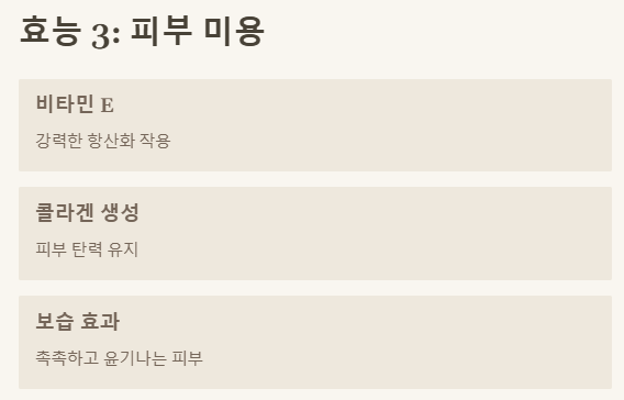 • ✅ 동안 비결: 비타민 E와 항산화 성분이 피부 미용 및 노화 방지에 효과적이에요.