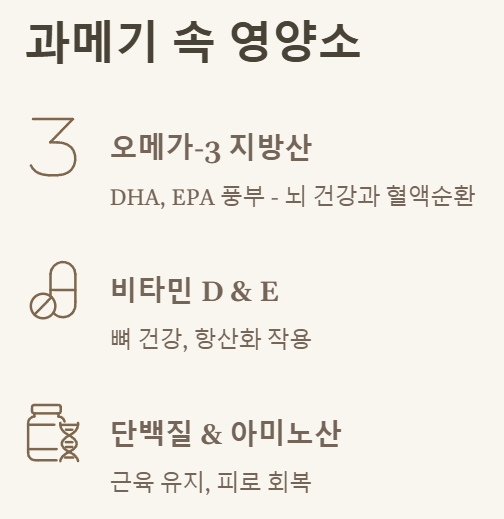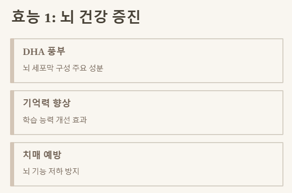 | 오메가-3 지방산 (DHA, EPA) | 뇌 기능 향상, 눈 건강, 혈액순환 개선, 염증 완화 |