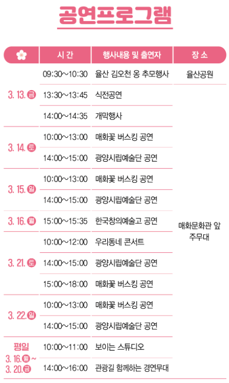 • 매화꽃 버스킹: 축제장 곳곳에서 수시로 열리는 버스킹 공연은 발길을 멈추게 하는 작은 감동을 선사할 거예요.