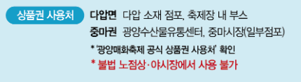 이 상품권은 축제장 내 부스뿐만 아니라 광양시 내 가맹점에서도 현금처럼 사용할 수 있어 실질적으로 무료라고 볼 수 있습니다.