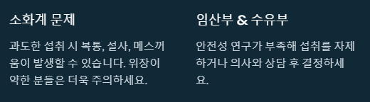 | 임산부 및 수유부 | 안전성 연구 부족, 섭취 자제 권고 |