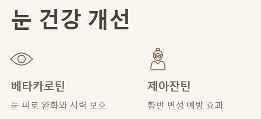 1. 면역력 강화 및 눈 건강: 비타민C, 베타카로틴 등 풍부한 영양소로 면역력을 높이고 눈을 보호해요.