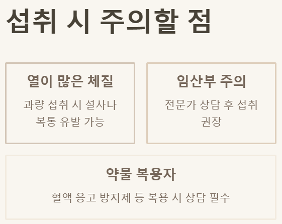 A: 네, 특별한 알레르기나 기저 질환이 없다면 매일 적정량을 섭취하는 것은 건강에 매우 이롭습니다. 하지만 앞서 말씀드린 대로, 몸에 열이 많거나 특정 약물을 복용 중인 경우, 그리고 임산부는 반드시 의사나 약사와 상담 후 섭취 여부를 결정하는 것이 중요합니다. 뭐든지 과유불급이라는 점 잊지 마세요!