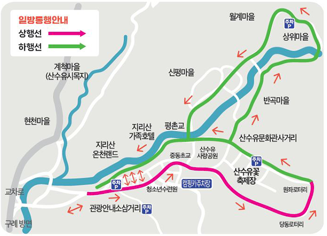 주요 노선은 산동면사무소, 관광안내소, 산수유마을 입구, 주 행사장, 반곡마을, 상위마을 등을 순환해요.